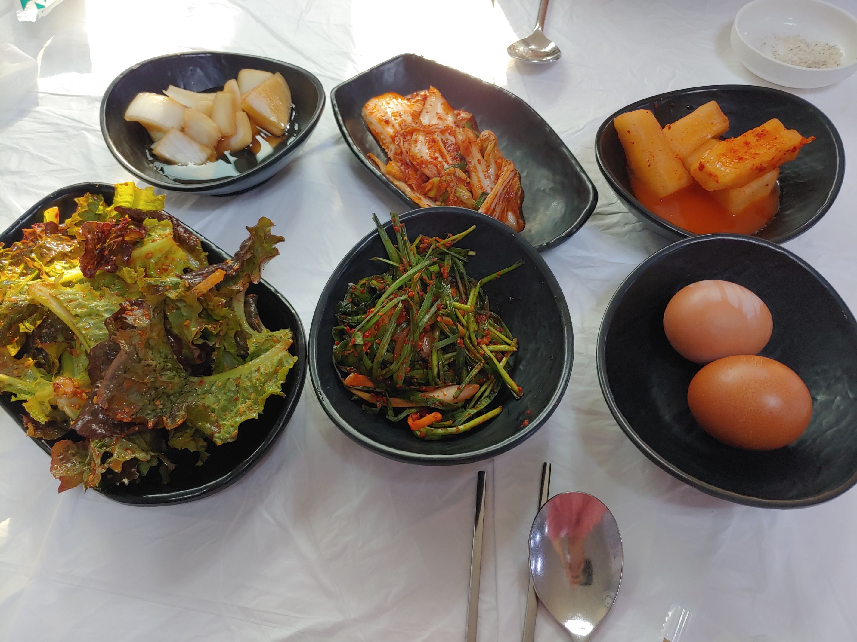 우린 예약을 하고 갔기때문에 테이블이 이미 셋팅되어이었다. 밑반찬은 총 6가지. 삼계탕과 잘어울리는 음식들로 한가득이었다. 이중 구운계란은 인원수에 맞춰 나온다. 구운계란이라 그런지 따끈한 온기가 그대로 유지되고 있어 식사가 나오전에 시식을했는데 와 구운계란이 이렇게 맛있을 줄이야.
